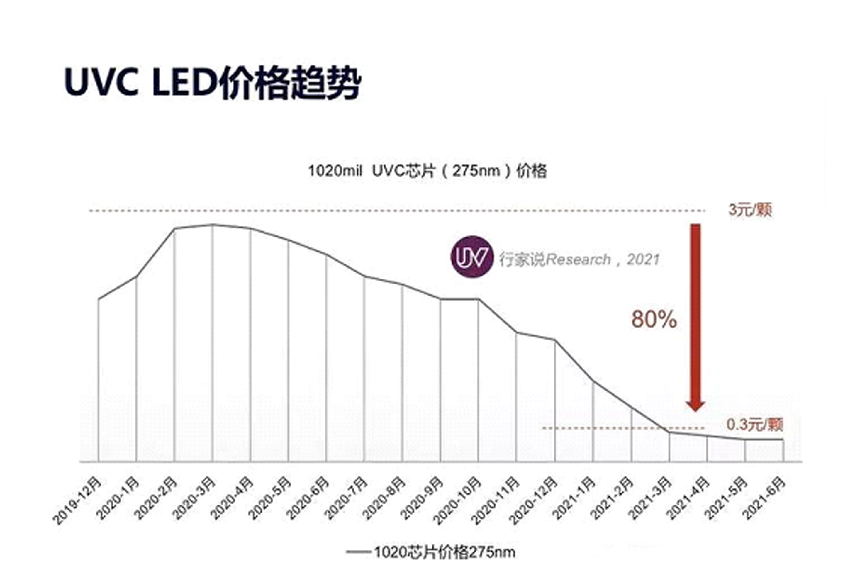 2019年疫情暴发至今UVC LED在消毒方面展现出其独特的优势,各大芯片、封装厂家也在不断地推出新产品,但由于专利和产量的原因相对于UVA LED芯片的成本还是比较高。然而《水俣公约》的生效正在加速汞灯的淘汰进程,而 UVC+UVA LED 就是最佳的选择!先来看看UVC LED的情况。以275nm的1020mil芯片为例,截至6月数据,UVC LED芯片价格降幅较疫情期间最高点下降超80%,市场中位数已经跌破0.5元/颗,低亮版已经处于0.3-0.4元/颗,对比疫情前(2019年价格),也有约70%的下降幅度。相信随着UVC在杀菌领域应用的不断扩大,相比现在的成本会有很大的改善,光固化技术到时候就可以真正地实现UVC+UVB+UVA替代现有的汞灯光源。