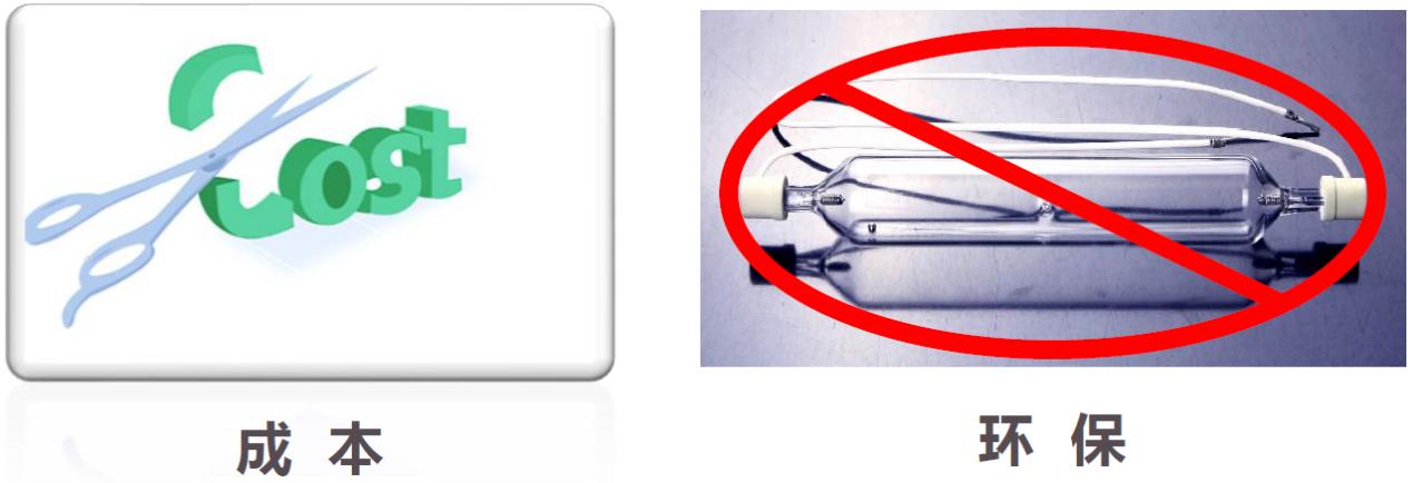 传统汞灯光源的发光波长涵盖了紫外光以及可见光等波段,里面的UVC和UVA是目前光固化配方主要的可利用光波段,从技术的角度上来讲,如果UVC LED和UVA LED能有机地结合起来将很有可能在不改变原配方的基础上替代现有的汞灯光源。汞灯光源属于高耗能设备,不但产生臭氧还存在着汞污染问题,而UV LED(UVA+UVB+UVC)正好能完美地解决这2个问题。